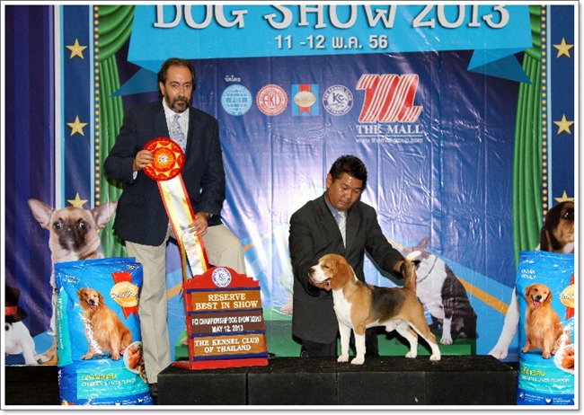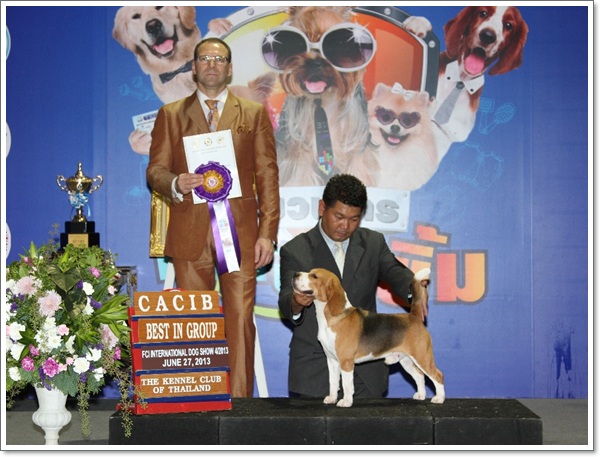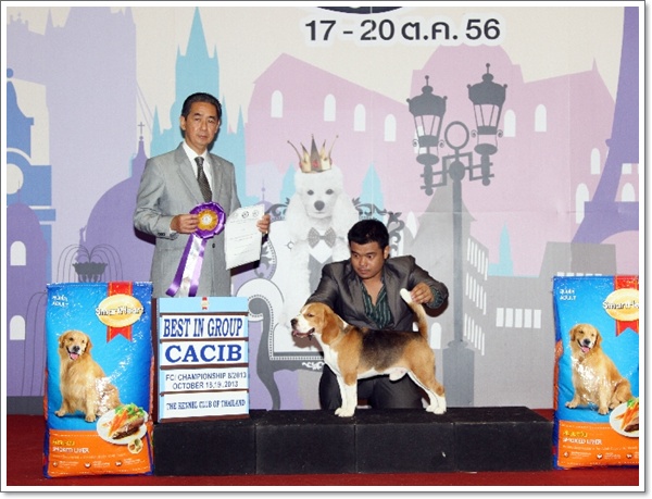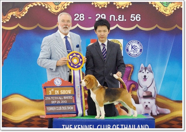 Bruce is the official Number 2 Beagle of Thailand in all breed and breed system; he finished Am Champion title since he was 7 month old and finished Grand American Champion since 13 month old at the Beagle Specialty 2012 a day before Beagle Nationals. He is a multiple group winner and wins many times at the international competitions such as the PCCI 50th Aniversary, the biggest dog show in Philippine 2012 which there were numerous top beagles and many of number 1 beagle of the Asian countries competing in the ring, Bruce won Breed and Group and finally Best in Show 3 at that show.