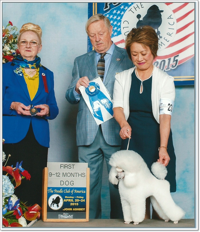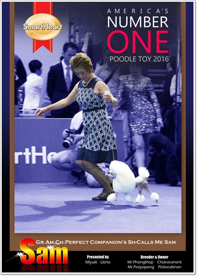 Sam, Grand.Am.Ch.Perfect Companion’s SH Calls me Sam, a son of Tina Maree, a Breed and Toy group winner from a puppy class. In the picture, Sam won the 9-12 month class at the Nationals 2015, Poodle Club of America, the Biggest show of the poodles in the states. Now Sam finished his Grand American champion title and Sam was Number 1 Toy Poodle of America in 2016